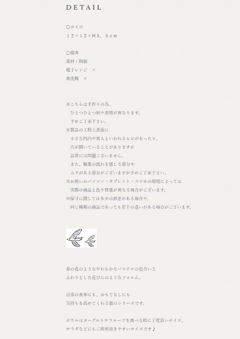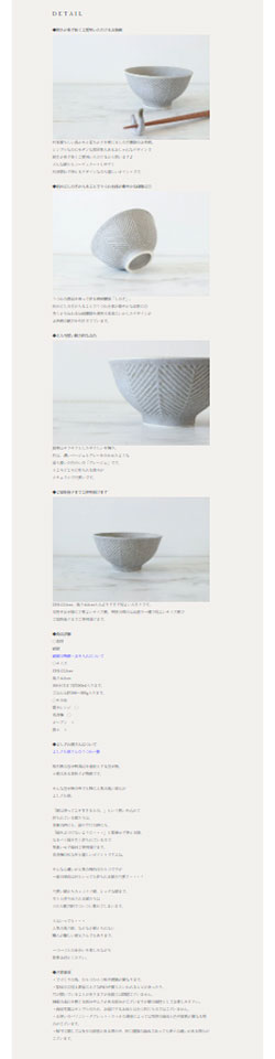商品紹介の部分については、以前は文字だけだったところを画像も表示するように変更しました。併せて、紹介文の量を増やすように。写真を見て買う方、文章を読むのが好きな方、お客様のタイプはそれぞれ。どちらのタイプでも伝わるように変更しております。(文章に関しては語彙力がないのが申し訳ないのですが…精進します。)