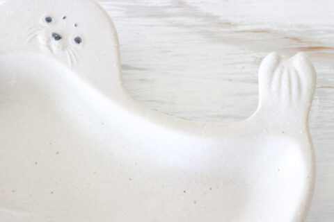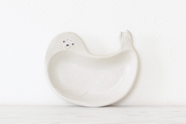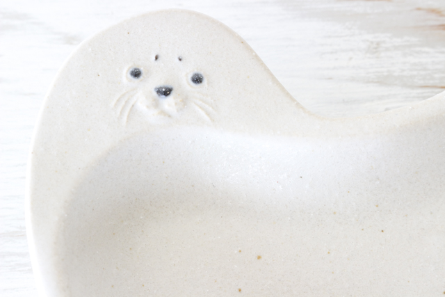 今回のいちおしはあざらしの豆皿。手のひらサイズの小さなお皿です。あざらしの表情がたまらなく愛らしい。ちょっと困り顔なのもたまりません。まるいからだと小さなしっぽもキュート。(なんだかエビフライにも見えてくるような・・・。)