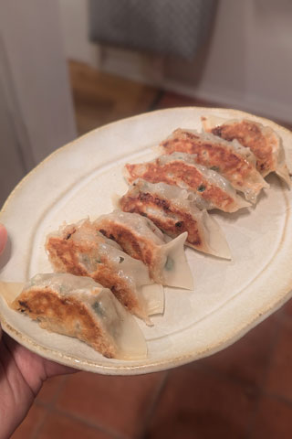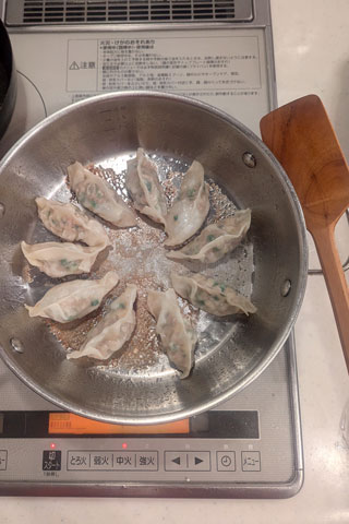 昨日包んだ餃子は60個。ちょっとずつ焼いては食べ、焼いては食べを6ターンほど。じっくりと焼く作業も楽しみます。