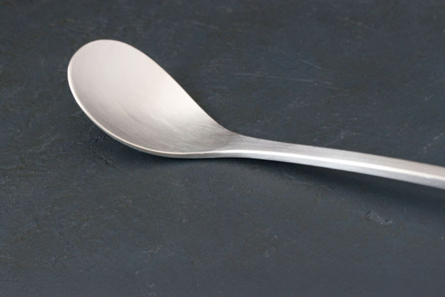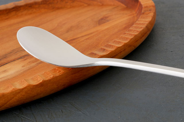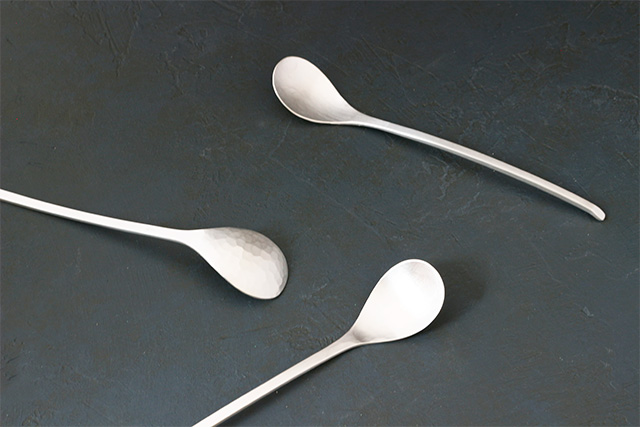 アルミ合金のスプーン。小さめのヘッドでデザートタイムに出番が多いサイズかと思います。茶碗蒸しなどにもおススメです。すでにお取り扱いをさせて頂いているデザートスプーン アルミ合金 里衣工房との違いはヘッド部分のカーブ。スプーンRの方が強めのカーブになっています。