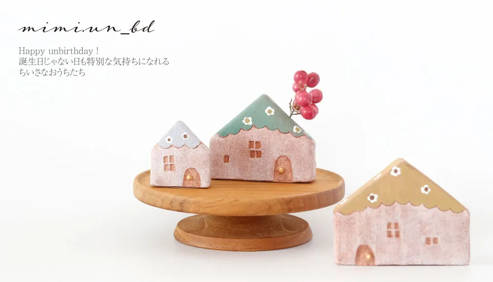 淡いピンク色がベースのちいさなおうちはそれぞれの屋根の色も個性豊かな仕上がり。みどりだったりブルーグレーだったり、黄色だったり。お花模様のおうちも!!