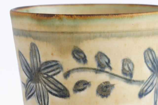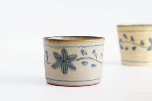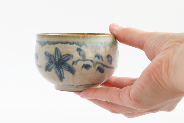 安南手とは、ベトナムから伝わった焼き物技法のひとつ。絵付けの上から溶けやすい釉薬をかけることで、青い線がやわらかくにじみ味わいのある表情に仕上がるのが特徴です。