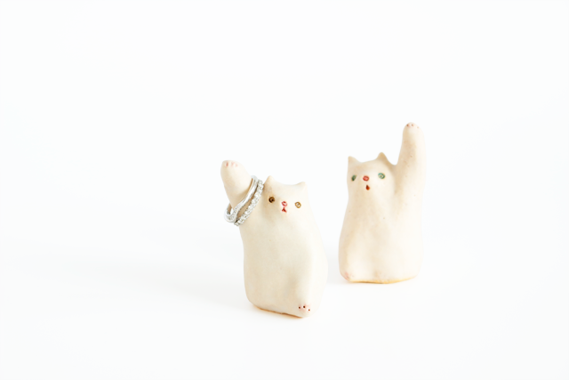 ぴんと手を挙げたねこちゃんのリングホルダー。まん丸の瞳が愛らしい存在です。お気に入りのリングをちょこんとかけて◎