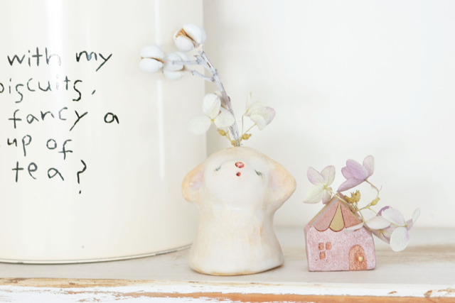 手のひらサイズの可愛らしい動物たち。裏側には穴がひとつあって、お好きなドライフラワーを飾って楽しんでいただけます◎ねこ?いぬ?さる?おおかみ…?こいずみさんに答えを尋ねようと思いましたが、答えはあるかもしれないし、ないのかもしれない。ただ「かわいい」ということだけ、それだけで充分ではないか!あえて答え合わせはしないことにしました◎