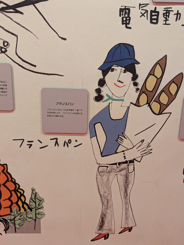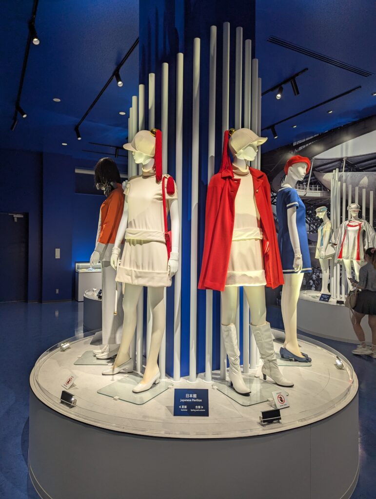 当時、「万博の花」と呼ばれたコンパニオンの衣装も展示されていました。今となっては時代錯誤甚だしいと議論が巻き起こるでしょうが、写真にうつるコンパニオンさんたちは皆、ミニスカートを着こなし自信に満ちた笑顔。とても美しく、時代の空気を感じさせてくれました。(写真は日本館の制服。国旗カラーで素敵)