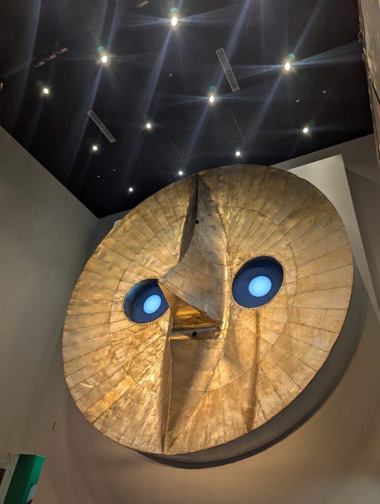 この記念館自体は2010年にオープンしていたそうですが(知らなかった…。)、2023年には別館も完成。そこでは太陽の塔の頂部にあった初代の「黄金の顔」が展示されています。どうやってあんな大きなものを建物に入れたのか…その答えを映像で見ることもでき、見応えたっぷりでした。