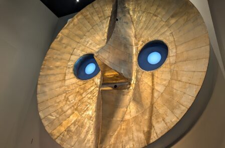 この記念館自体は2010年にオープンしていたそうですが(知らなかった…。)、2023年には別館も完成。そこでは太陽の塔の頂部にあった初代の「黄金の顔」が展示されています。どうやってあんな大きなものを建物に入れたのか…その答えを映像で見ることもでき、見応えたっぷりでした。
